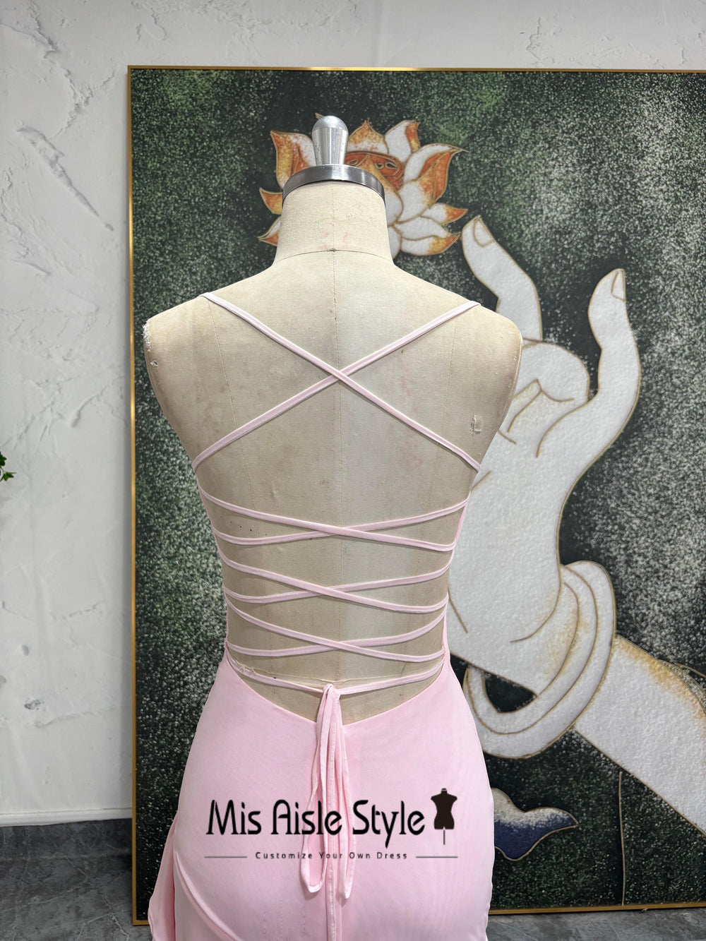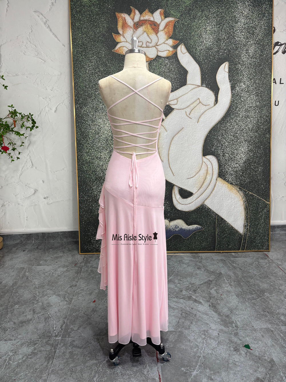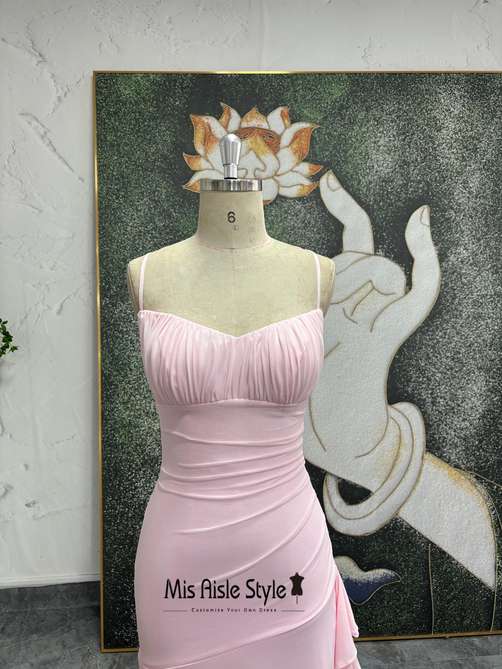 Blush Pink Ruched Spaghetti Strap Maxi Dress with Side Ruffle Hem