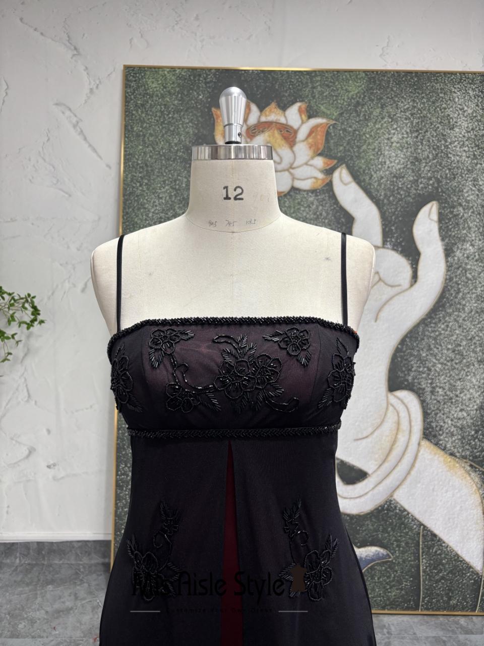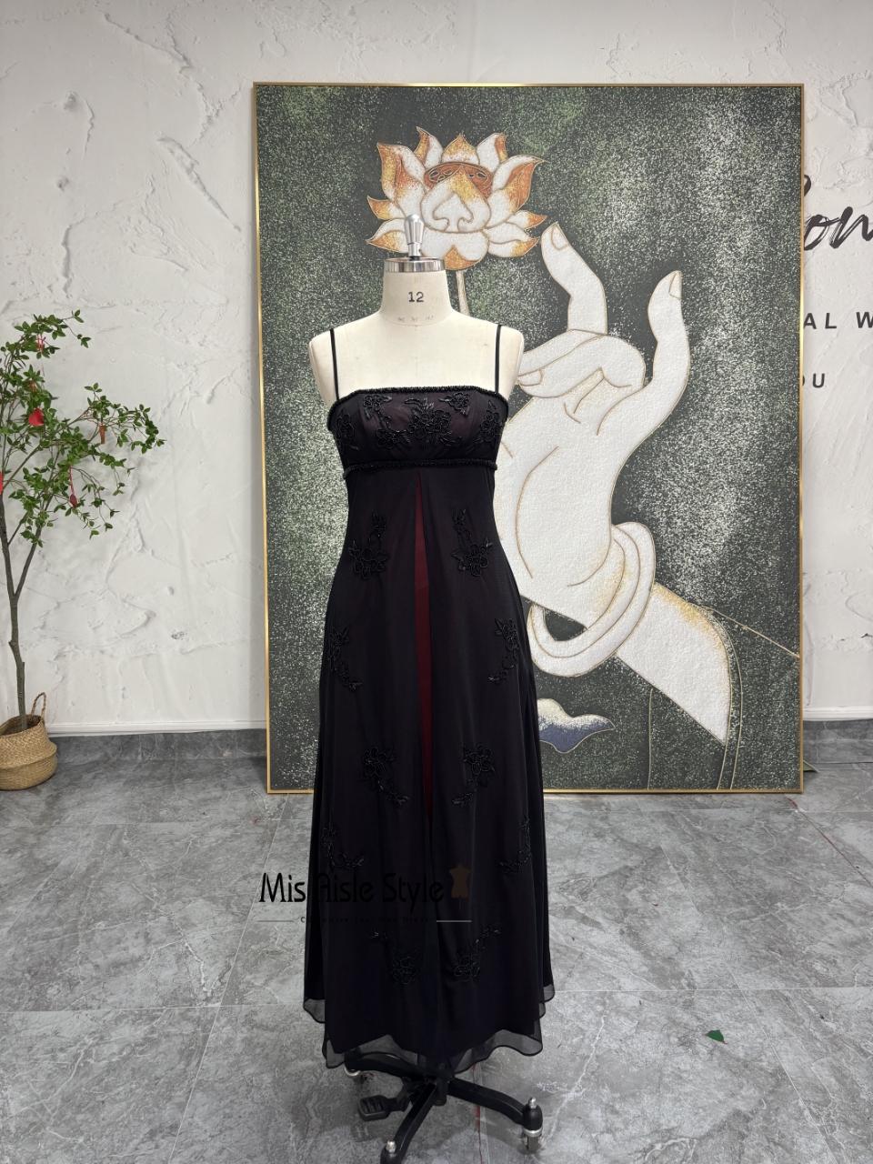 Vintage Handmade Beaded Black and Red Tulle Prom Dress